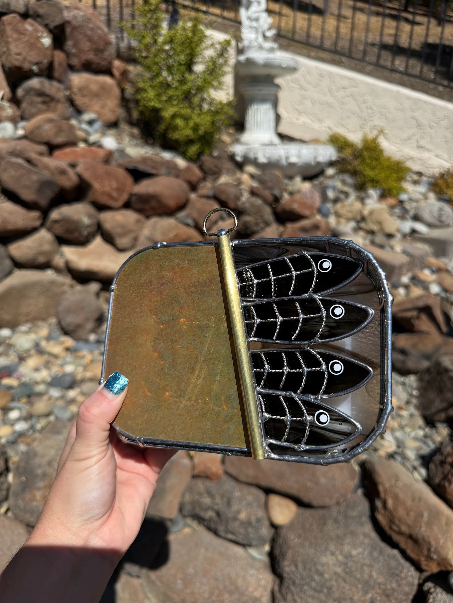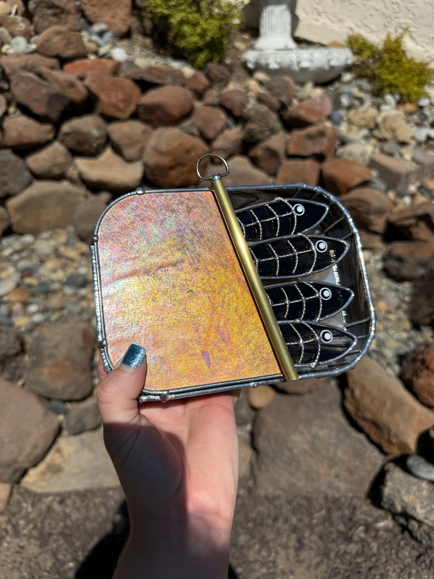 The sardines are made from a wispy black glass and finished with an intricately crafted wireworked skeleton. For the lid, I chose a golden iridescent glass that I've held onto for a truly special piece. The outer tin is made with a wispy black and white glass completing the spooky look.