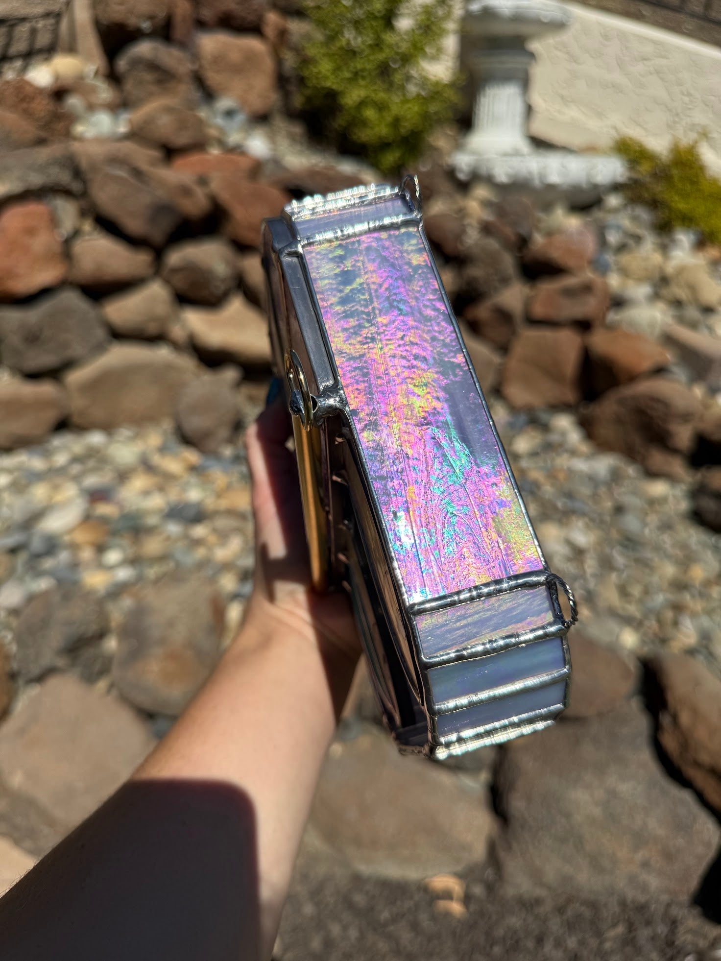 Please note: As with all stained glass pieces made using 60/40 tin/lead solder, washing your hands after handling is recommended. Lead can be harmful if ingested—this lamp is for lighting up your space, not snacking on ;)