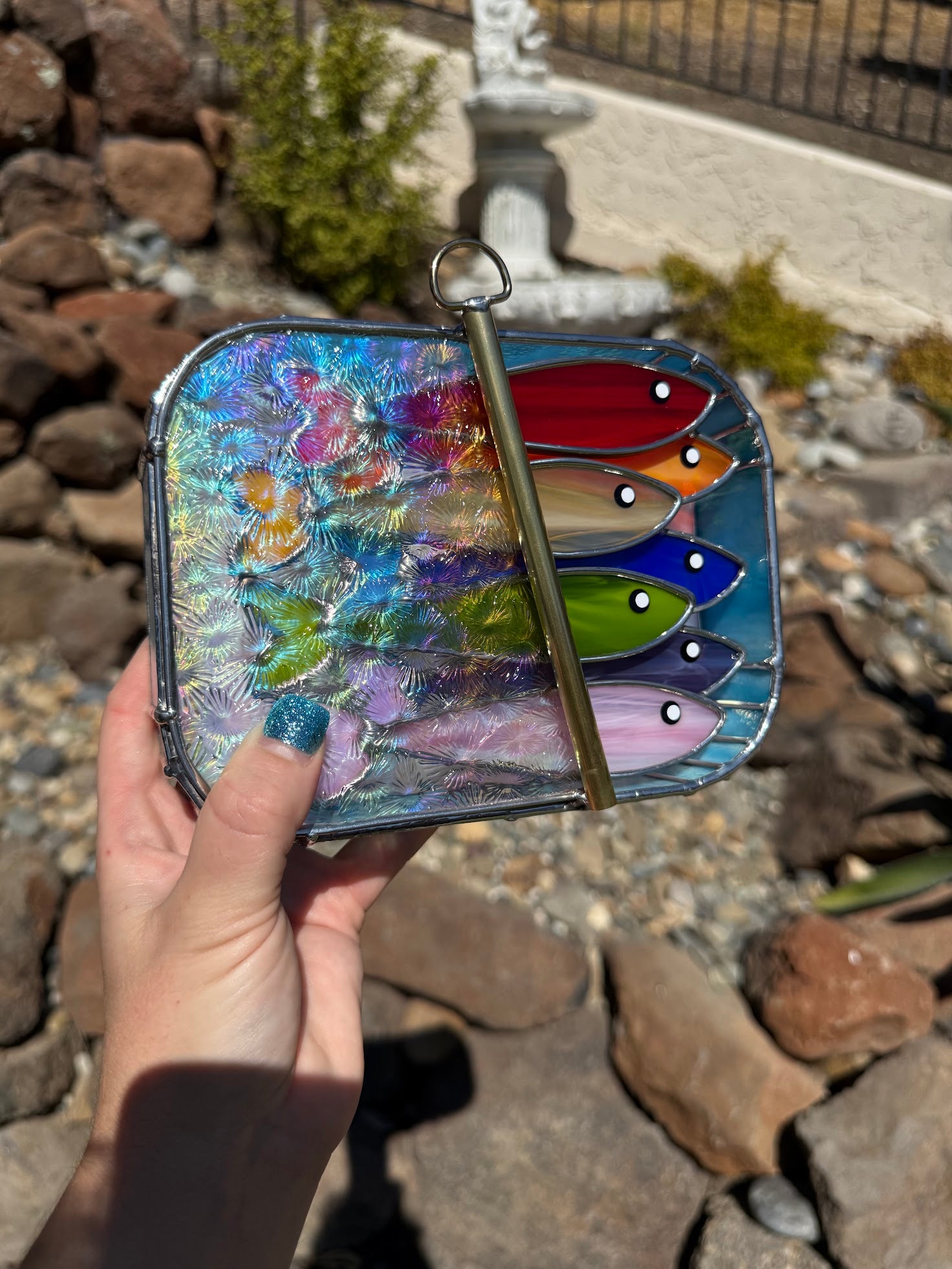 The sardines are made from a beautiful rainbow array of wispy transparent glass and matching opaque glass for their tails that can be seen through its iridescent florentine textured lid. The outer body is made from a wispy baby blue glass.