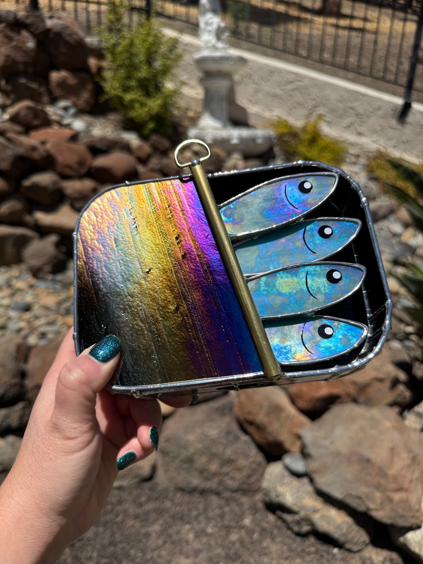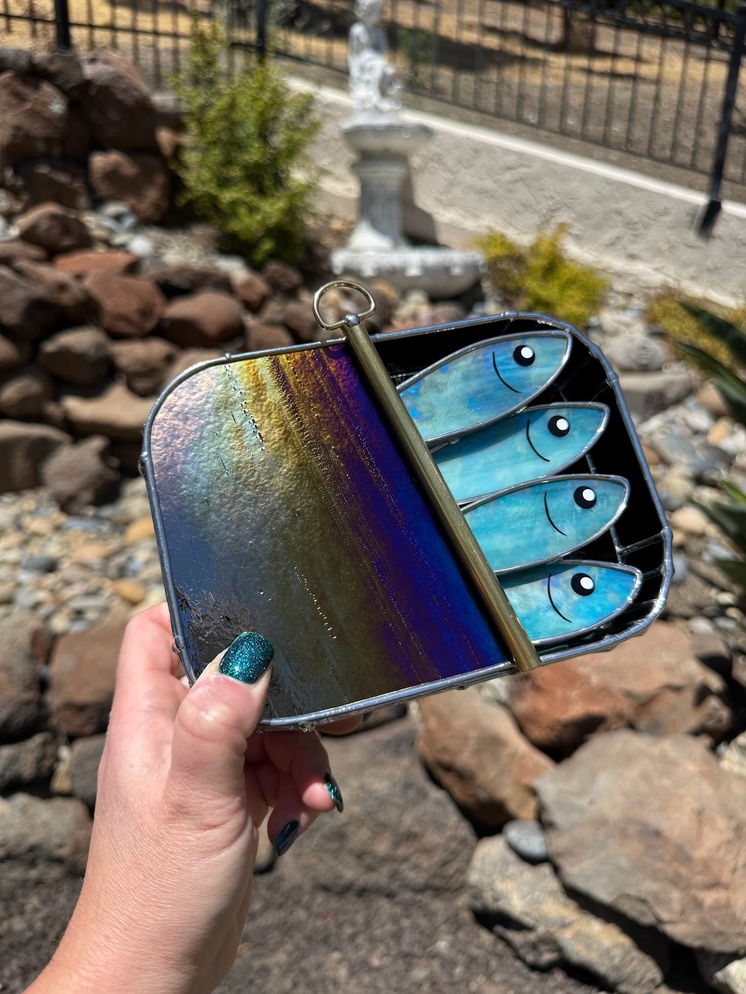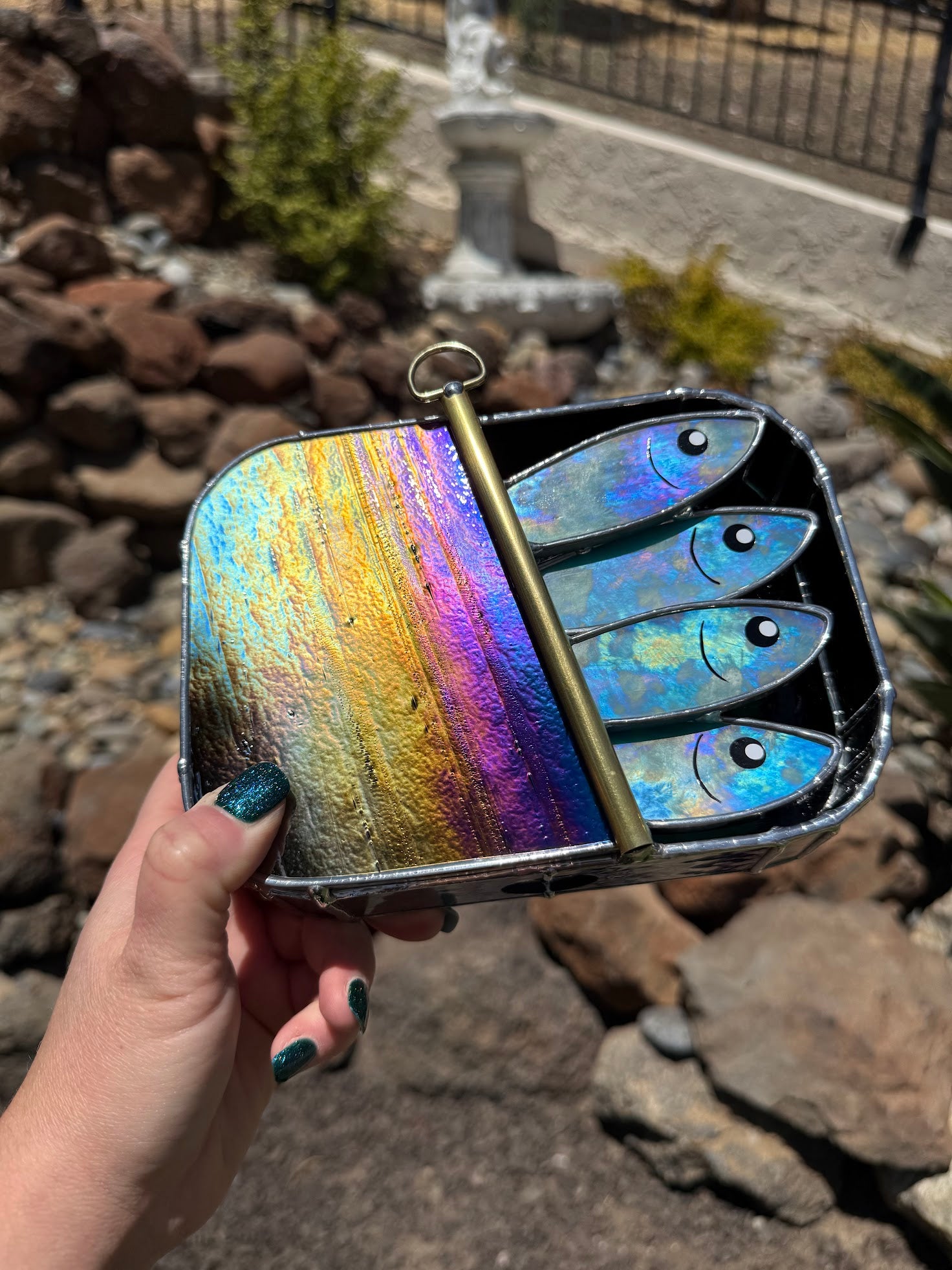 The sardines are made from a unique aqua burst stained glass and paired with an oil-slick like iridescent black glass for the lid. The outer tin is made from a wonderfully rainbow iridescent black glass to complete the oily sardine vibes.