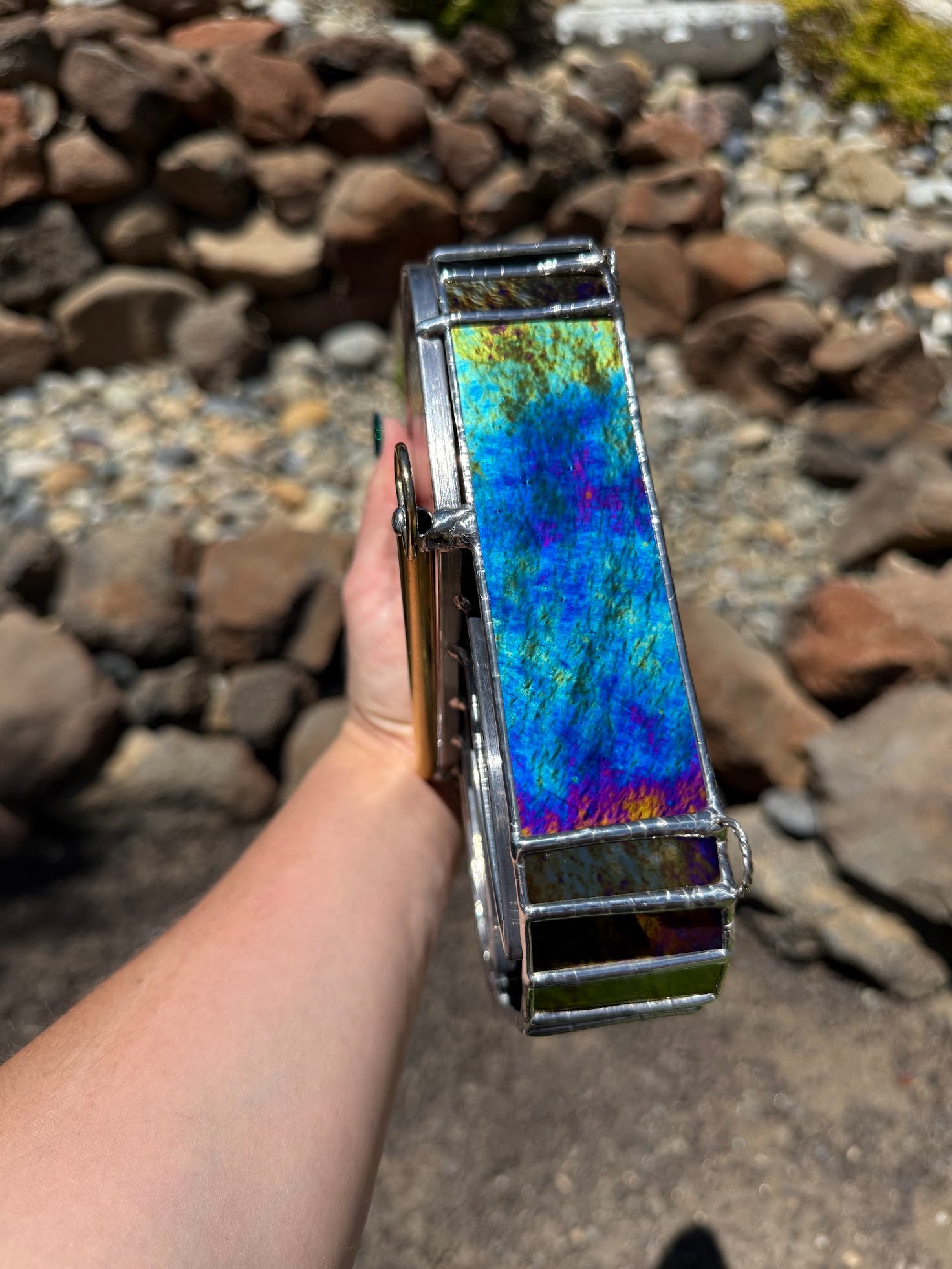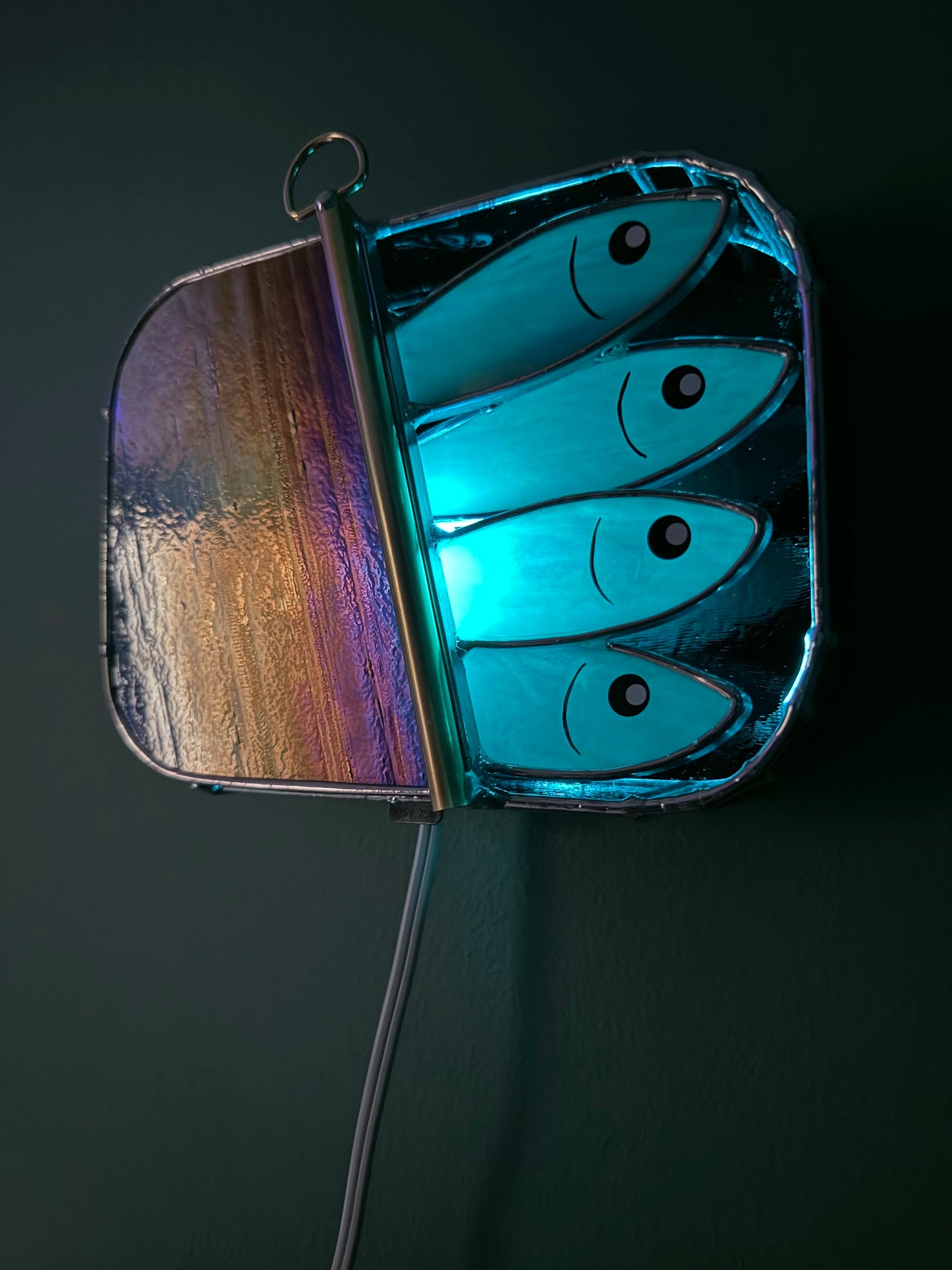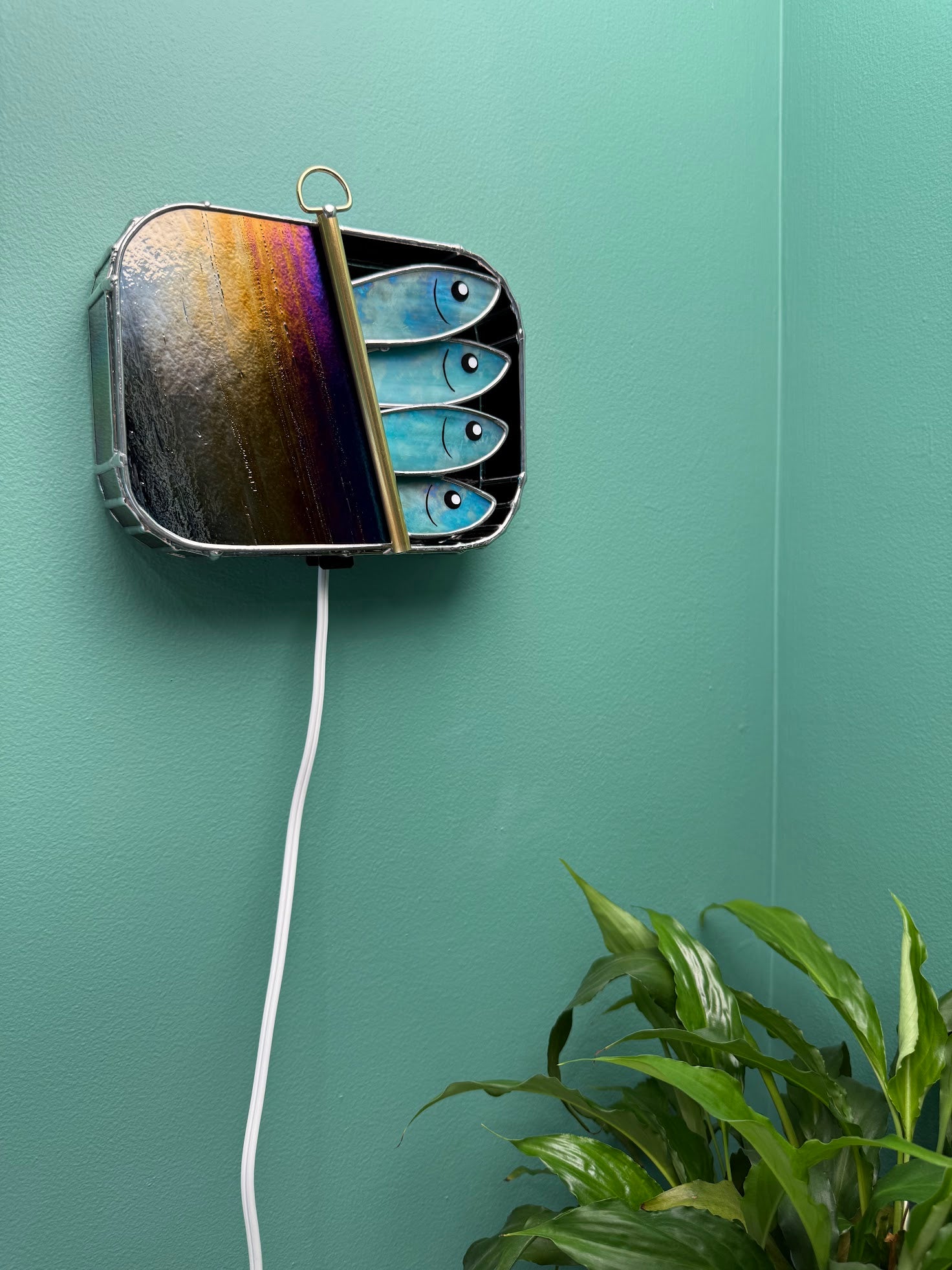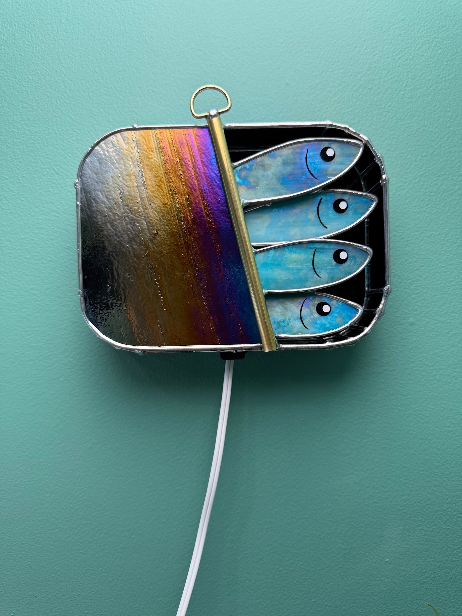 The sardines are made from a unique aqua burst stained glass and paired with an oil-slick like iridescent black glass for the lid. The outer tin is made from a wonderfully rainbow iridescent black glass to complete the oily sardine vibes.