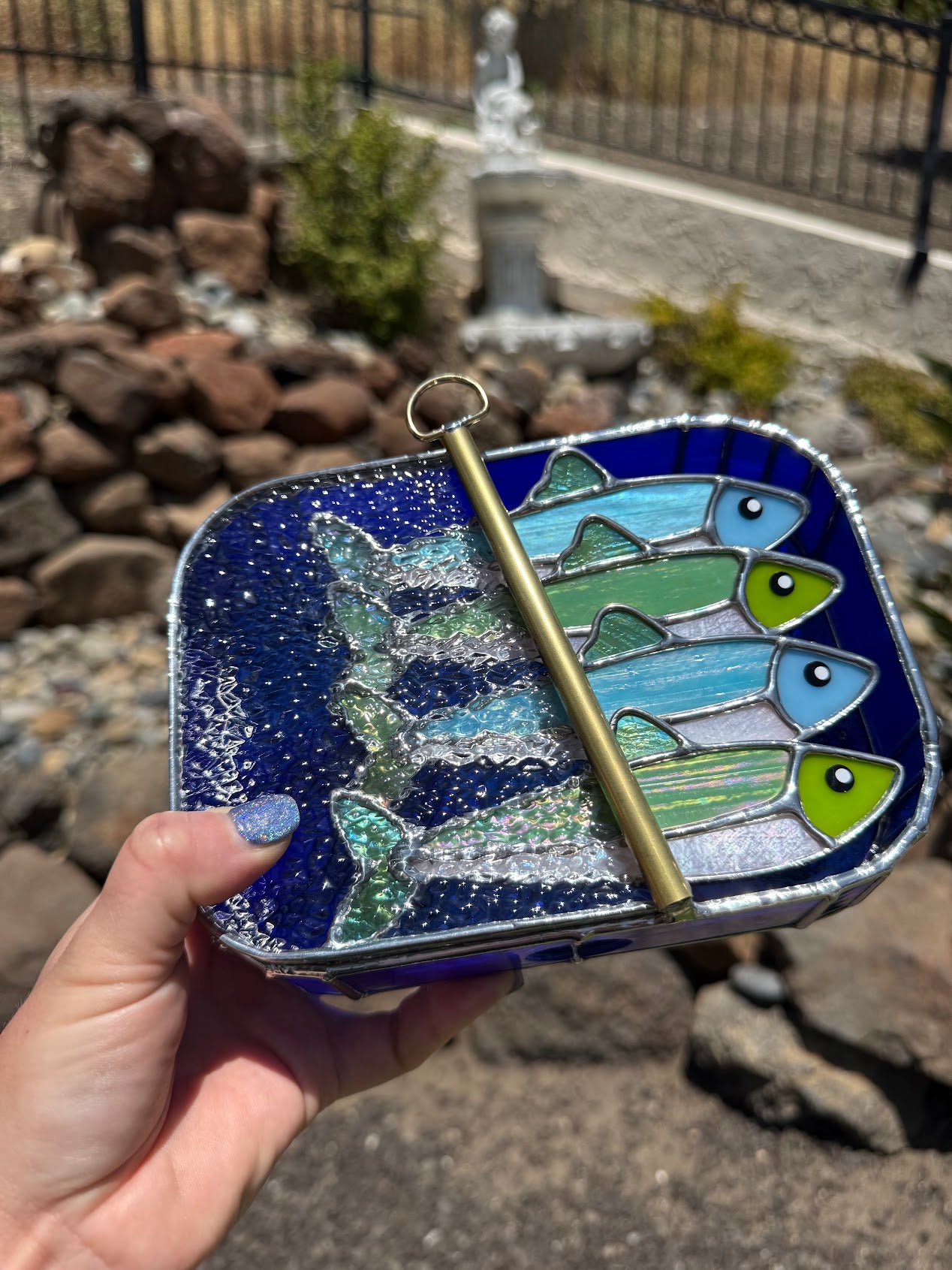 Each sardine is made with a mix of beautifully iridescent blue, green and white glass to capture the shimmering of real fish. For the lid I chose a textured clear glass, offering a peek inside the whimsical tin of sardines. The outer body of the tin is made from a wispy deep blue glass to complete the ocean-inspired vibe.