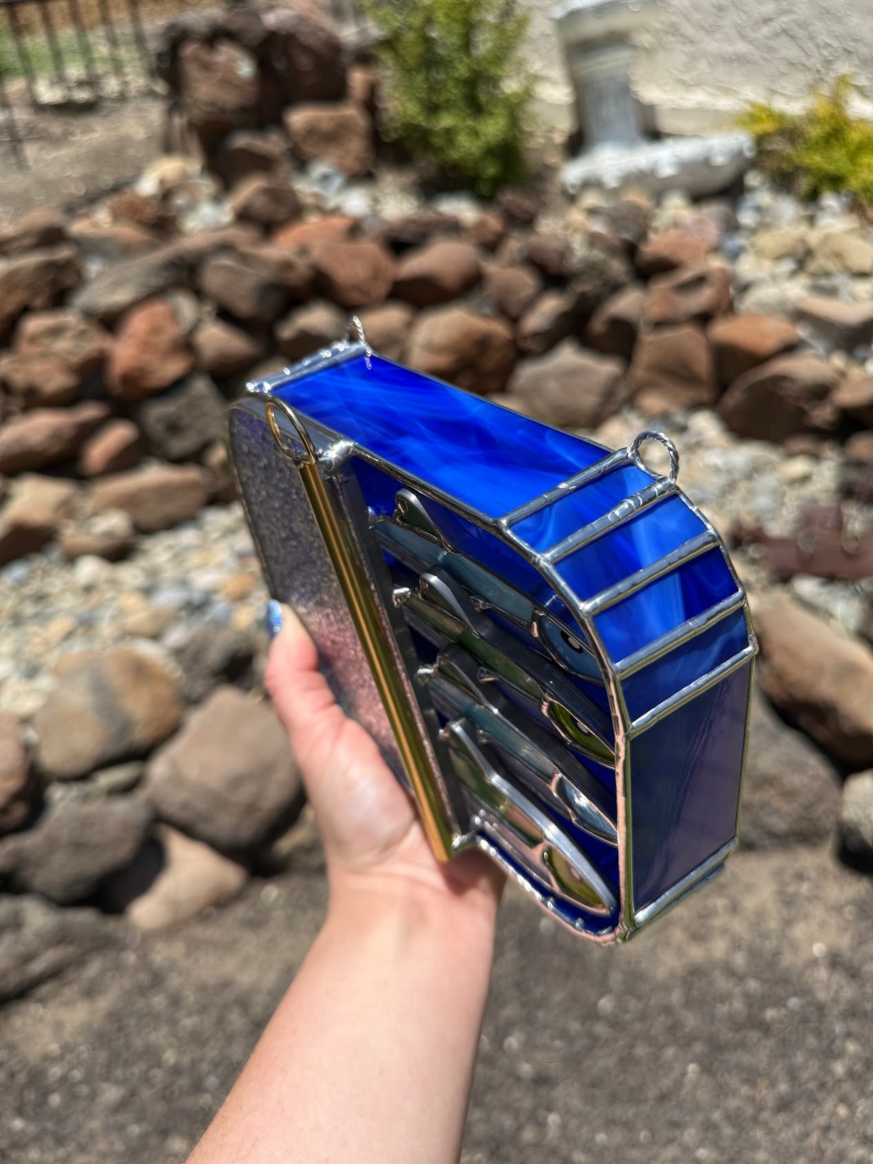 Please note: As with all stained glass pieces made using 60/40 tin/lead solder, washing your hands after handling is recommended. Lead can be harmful if ingested—this lamp is for lighting up your space, not snacking on ;)