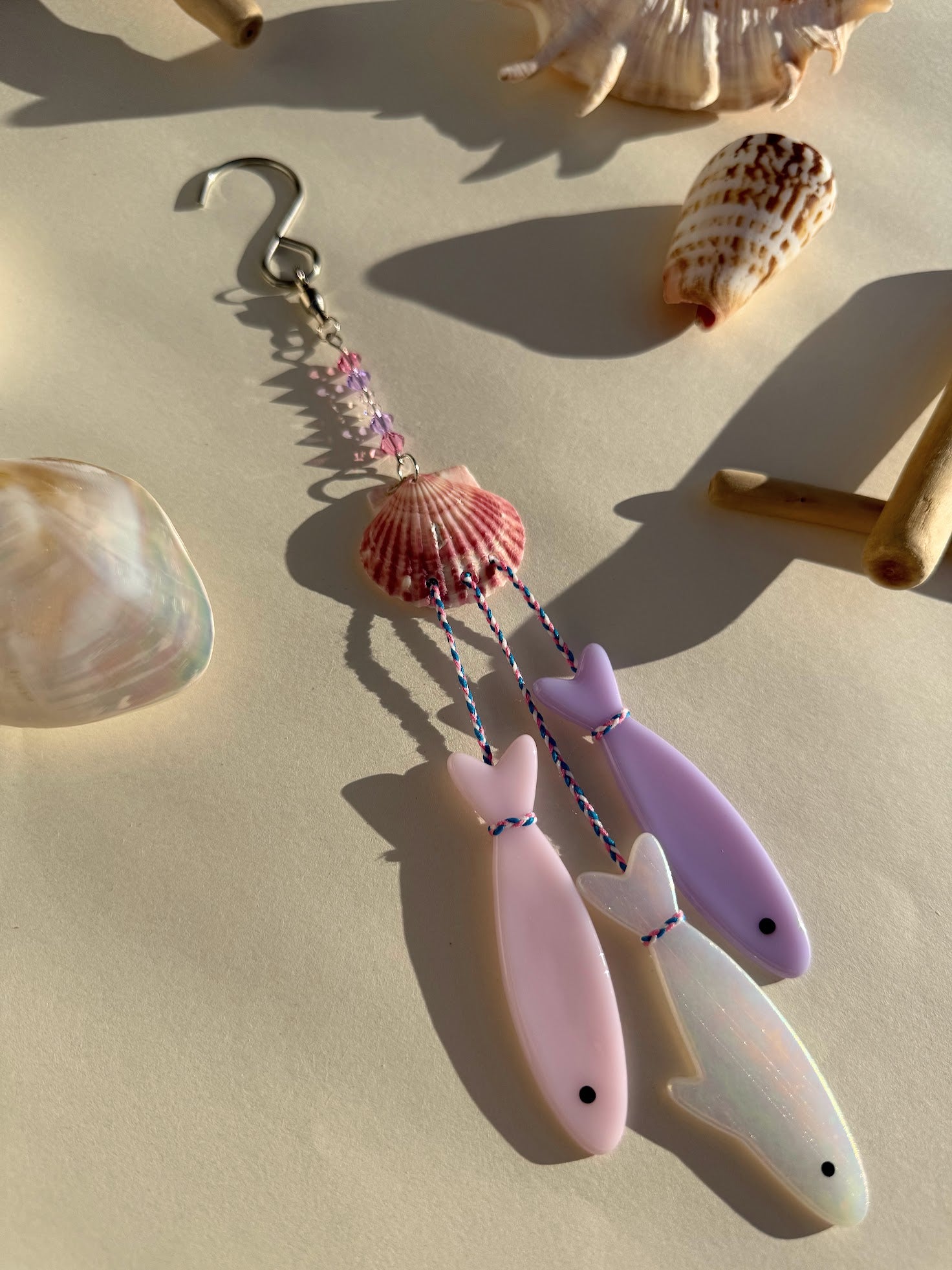 One of One! Stained Glass Sardine Wind Chime Coastal Sun Catcher, Handmade Glass Hanging Art, Pink Shell