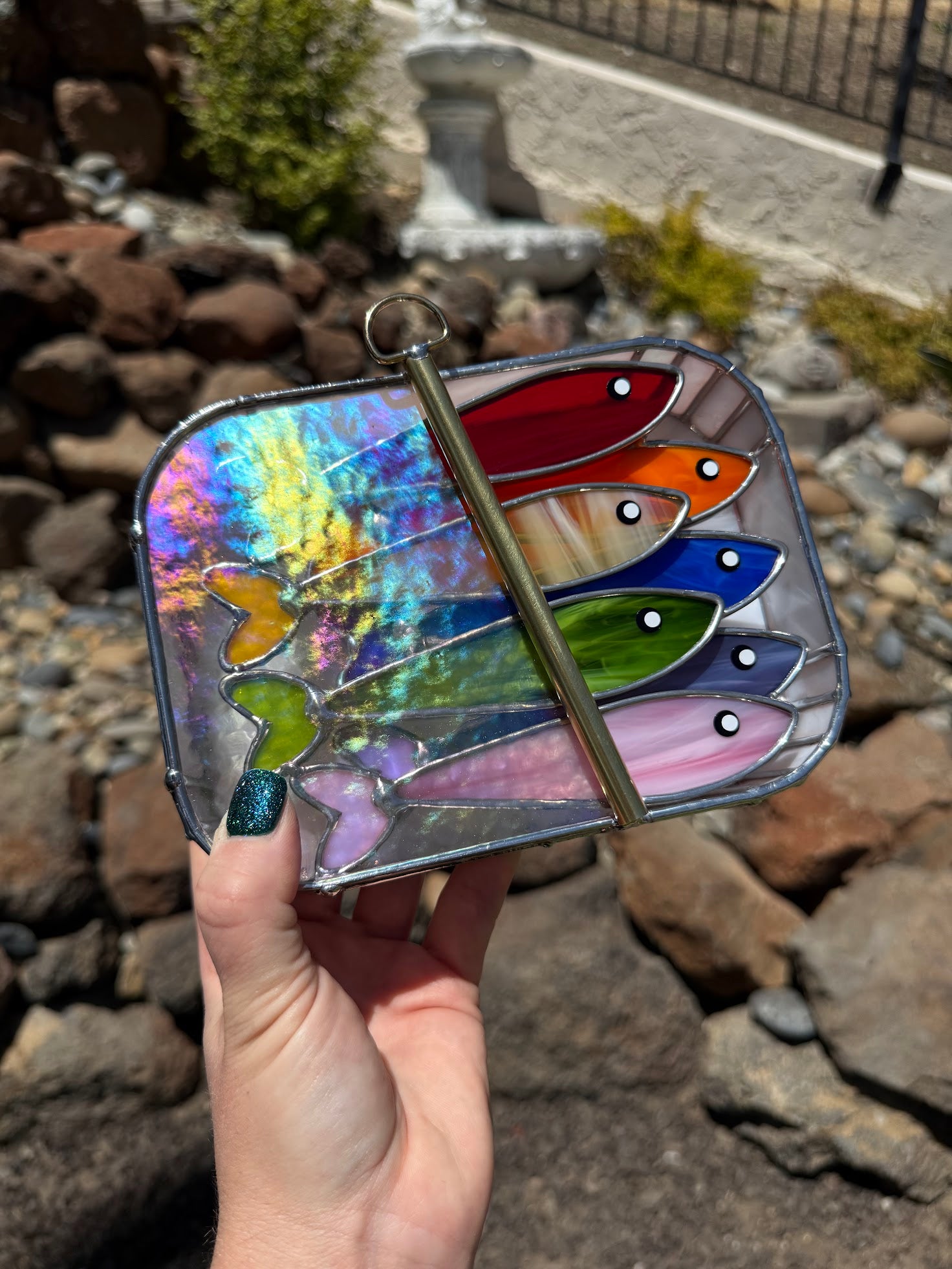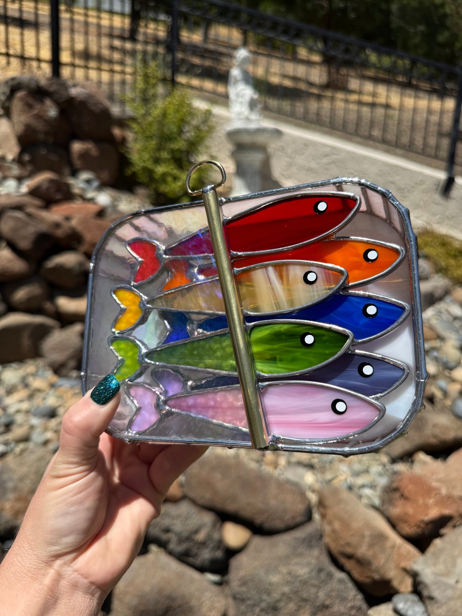 The sardines are made from a beautiful rainbow array of wispy transparent glass and matching opaque glass for their tails that can be seen through its iridescent textured lid. The outer body is made from a wonderfully iridescent pearly white glass.