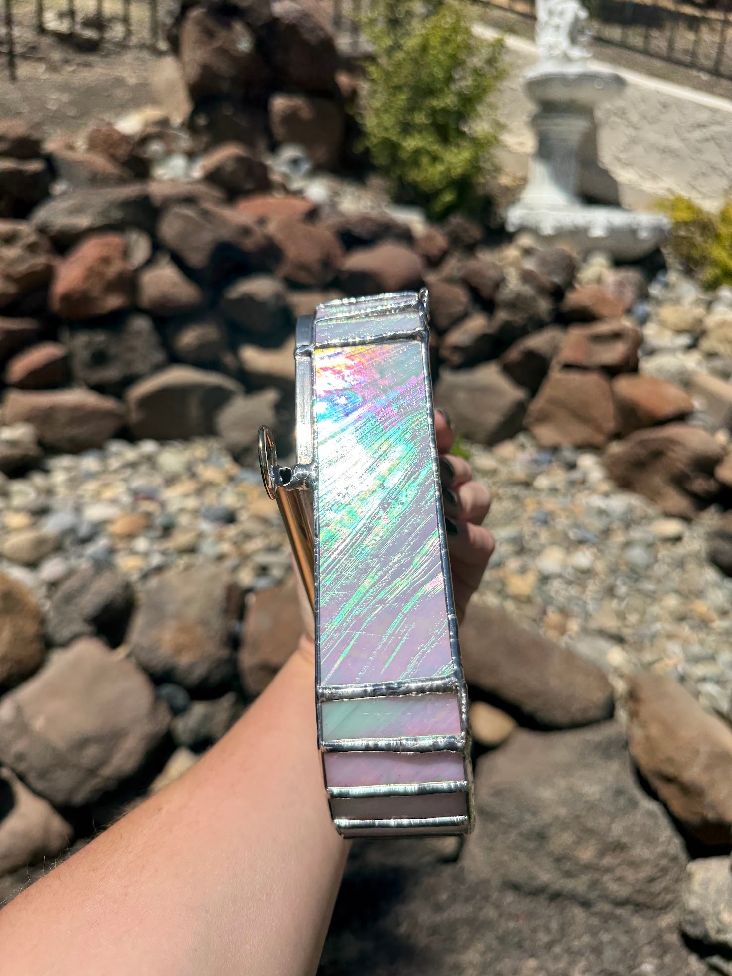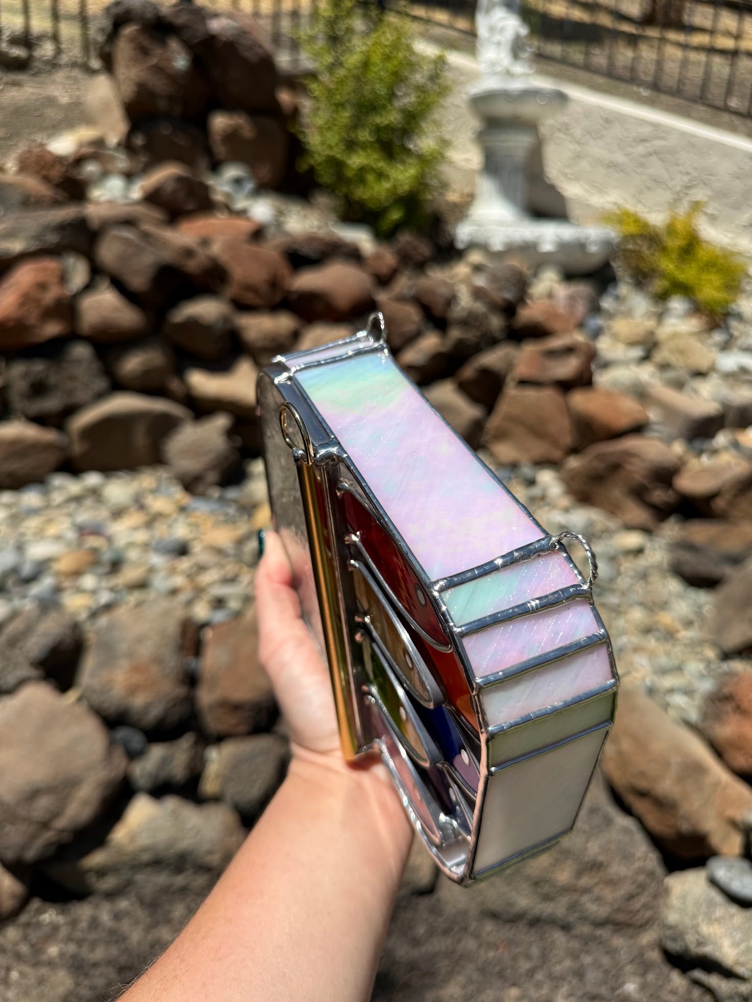 Please note: As with all stained glass pieces made using 60/40 tin/lead solder, washing your hands after handling is recommended. Lead can be harmful if ingested—this lamp is for lighting up your space, not snacking on ;)