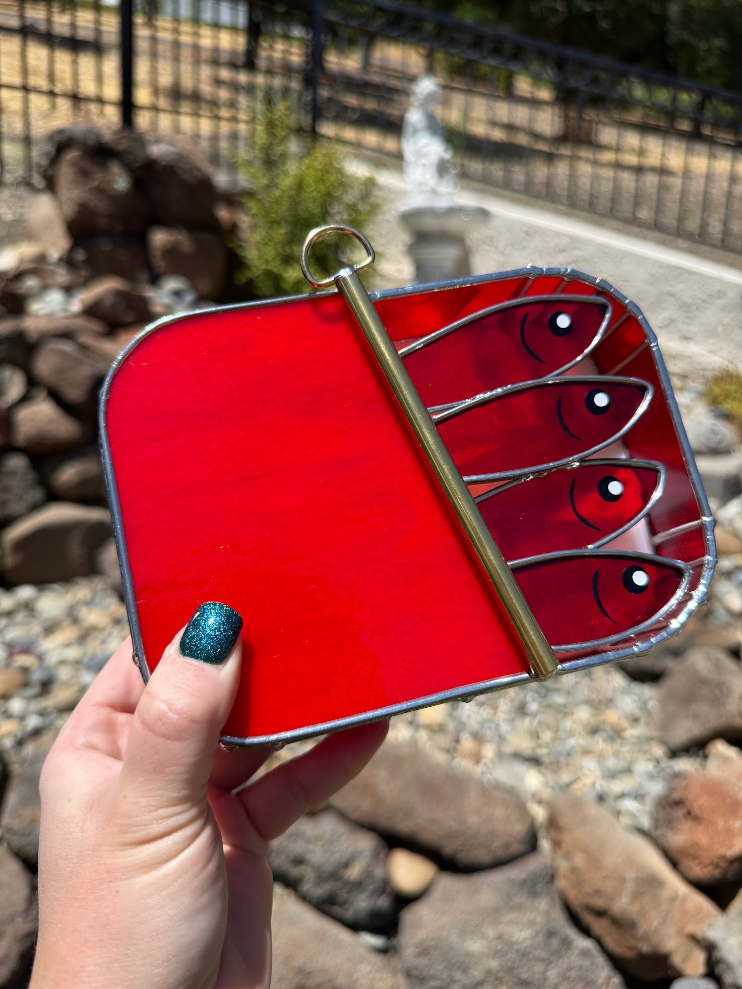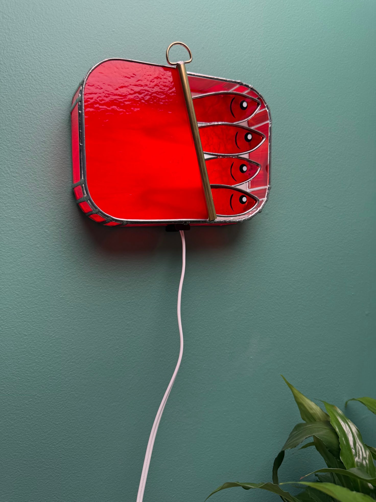 The sardines are made from a beautiful red mottled glass that reveals an unexpectedly moldy-looking glow when the lamp is lit. For the lid, I chose a deep, solid deep red to really hero the bold ruby vibes. The outer body is made from a wonderfully wispy deep red glass.