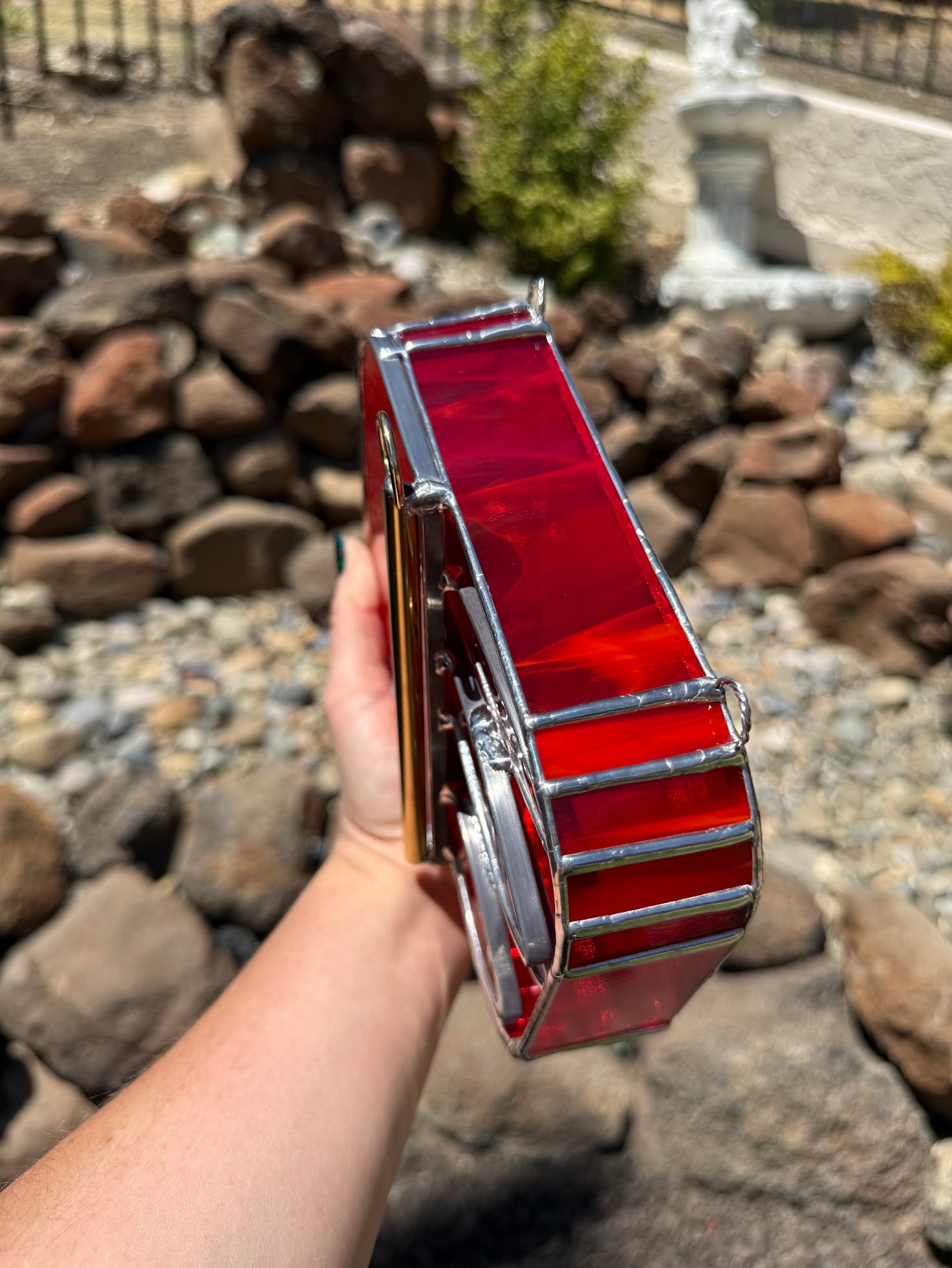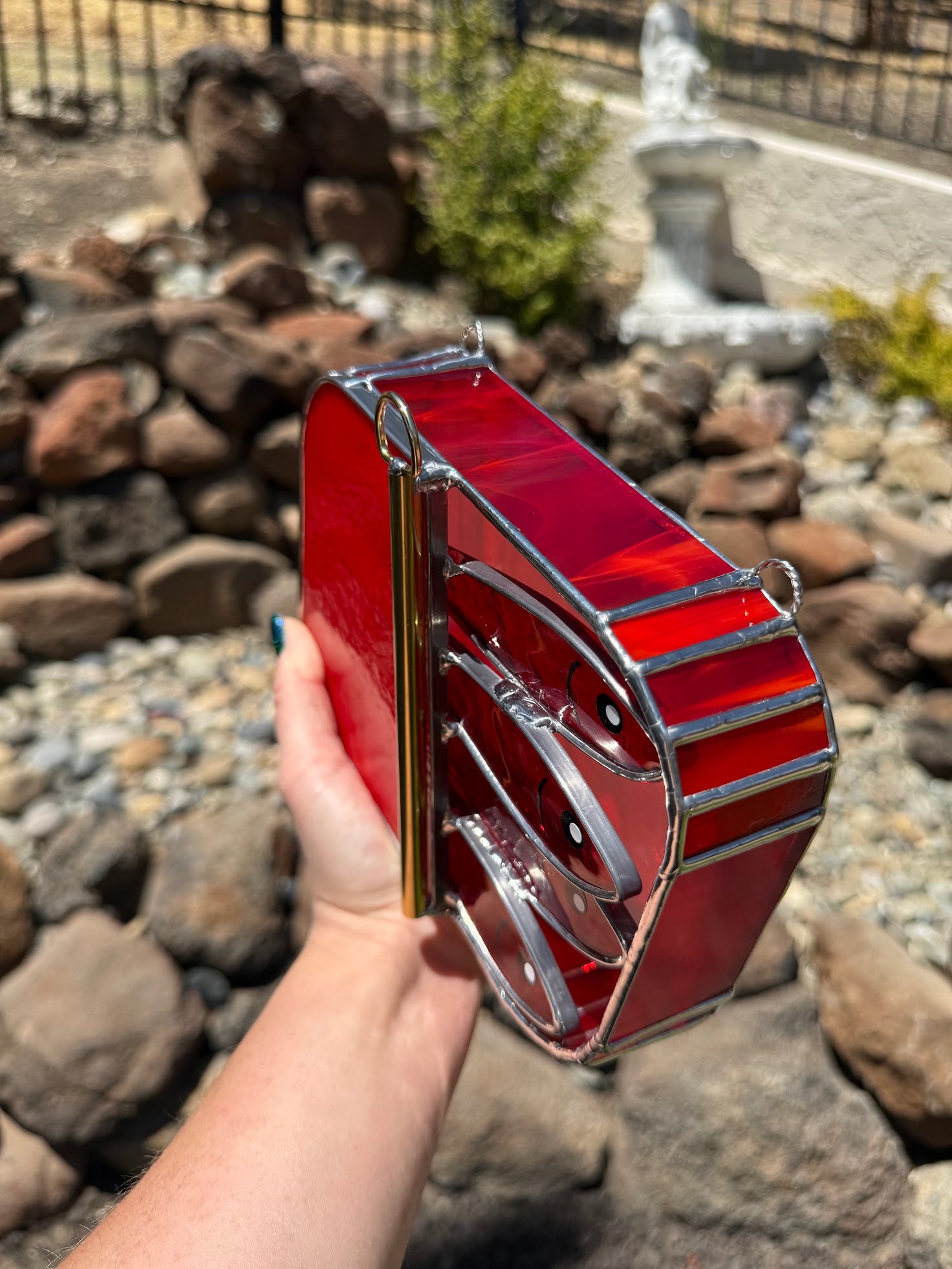 Please note: As with all stained glass pieces made using 60/40 tin/lead solder, washing your hands after handling is recommended. Lead can be harmful if ingested—this lamp is for lighting up your space, not snacking on ;)