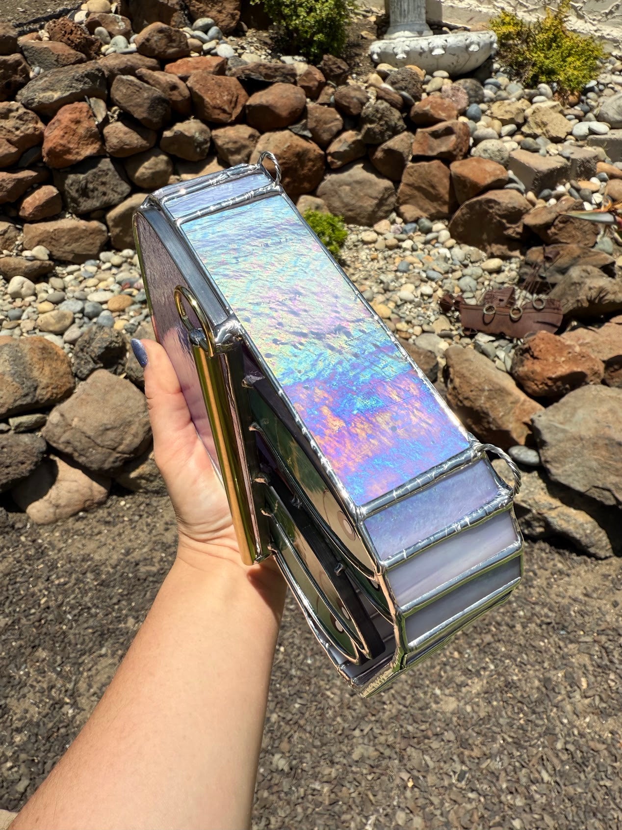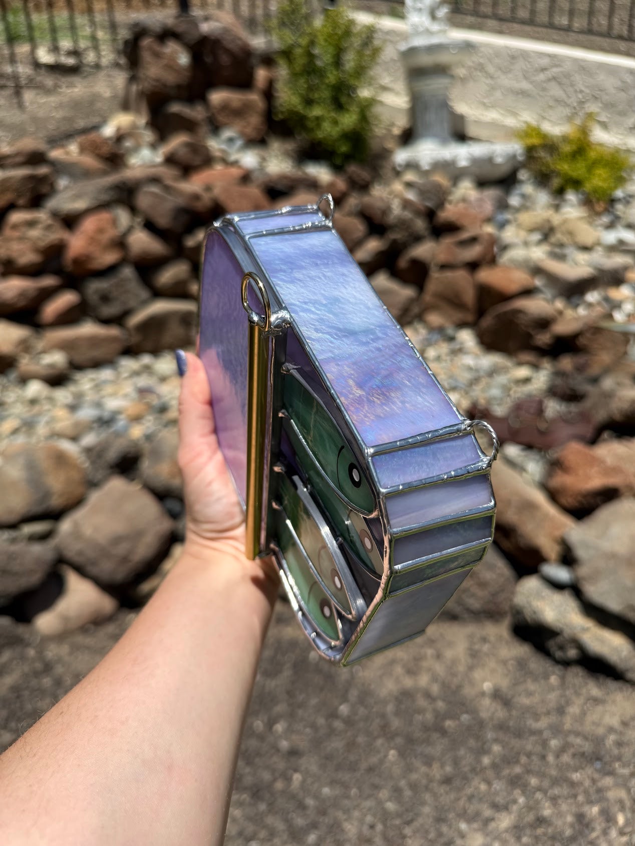 Please note: As with all stained glass pieces made using 60/40 tin/lead solder, washing your hands after handling is recommended. Lead can be harmful if ingested—this lamp is for lighting up your space, not snacking on ;)