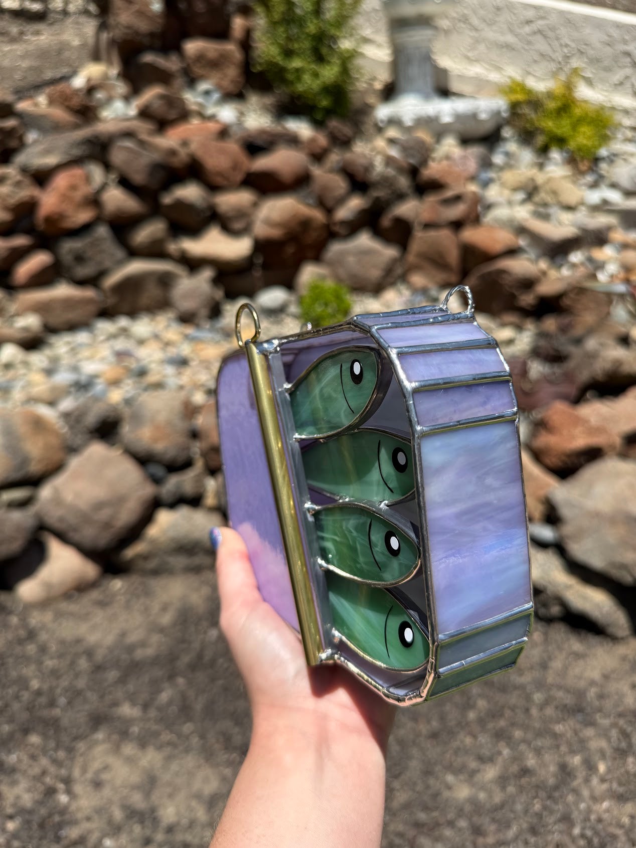 The sardines are made from a beautiful wispy sage green glass that perfectly complements its lavender lid. The outer body is made from a wonderfully iridescent lavender glass.