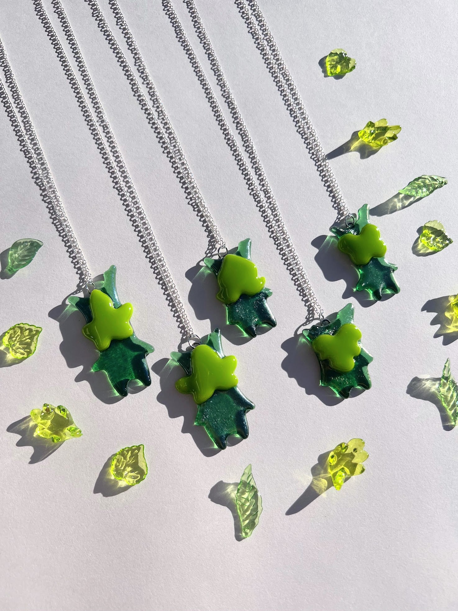 Yahaha! Bring a touch of the Magic of Zelda to your look with this Stained Glass Fused Korok Necklace!