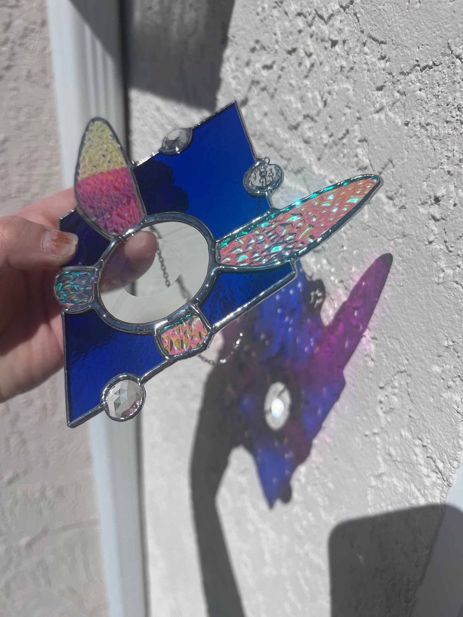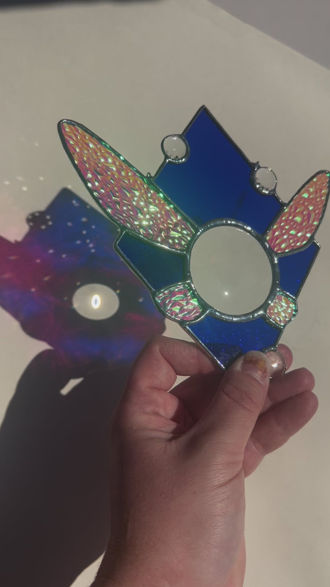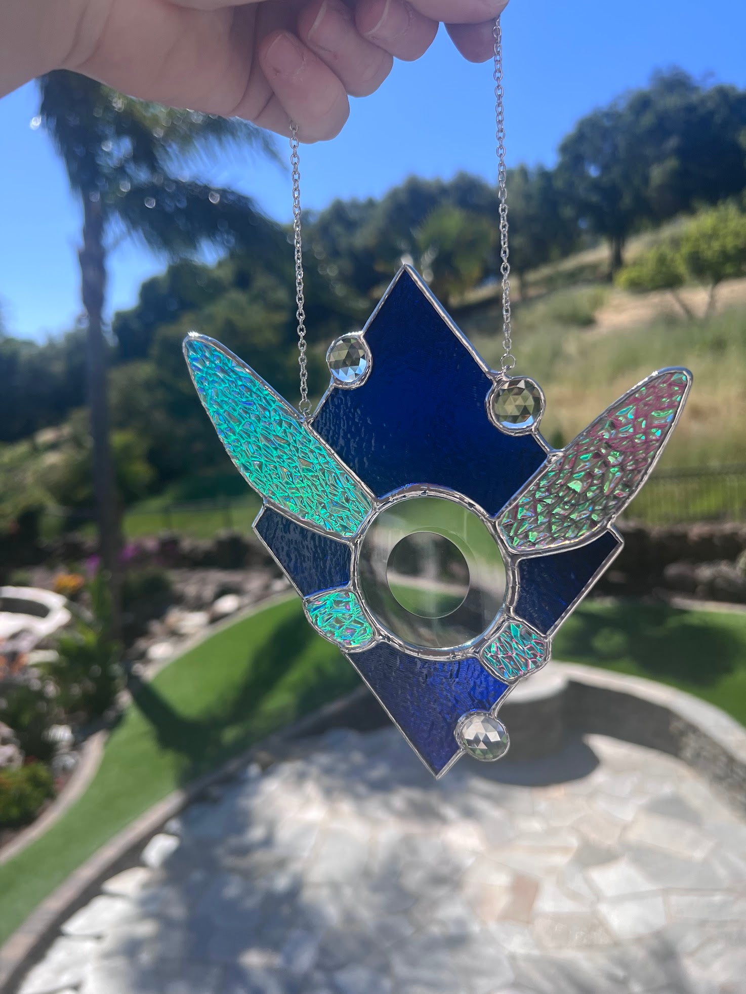 This one-of-a-kind Navi Suncatcher is meticulously crafted with dichroic stained glass, deep blue stained glass, and faceted gems from Germany!