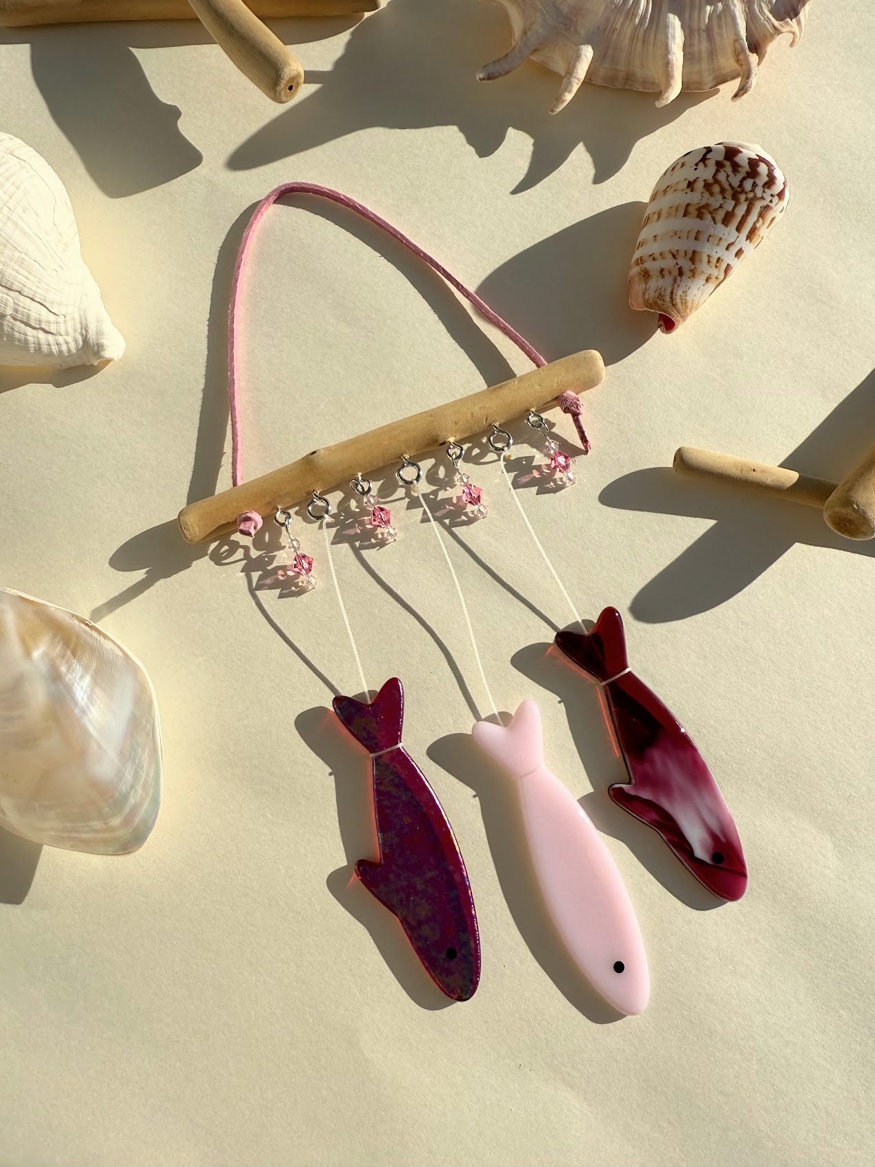 Stained Glass Sardine Wind Chime Coastal Sun Catcher, Handmade Glass Hanging Art, Sunrise Pink