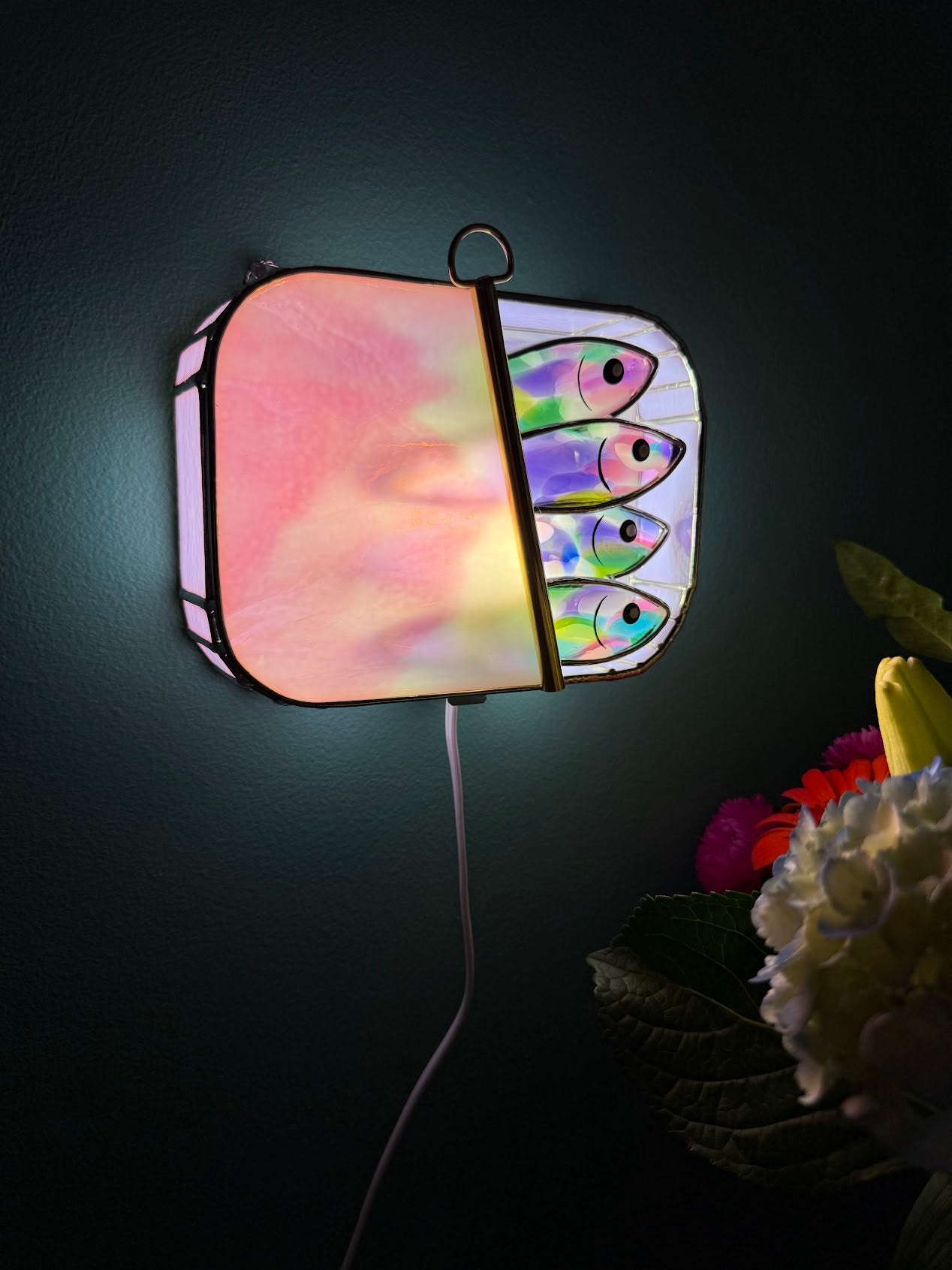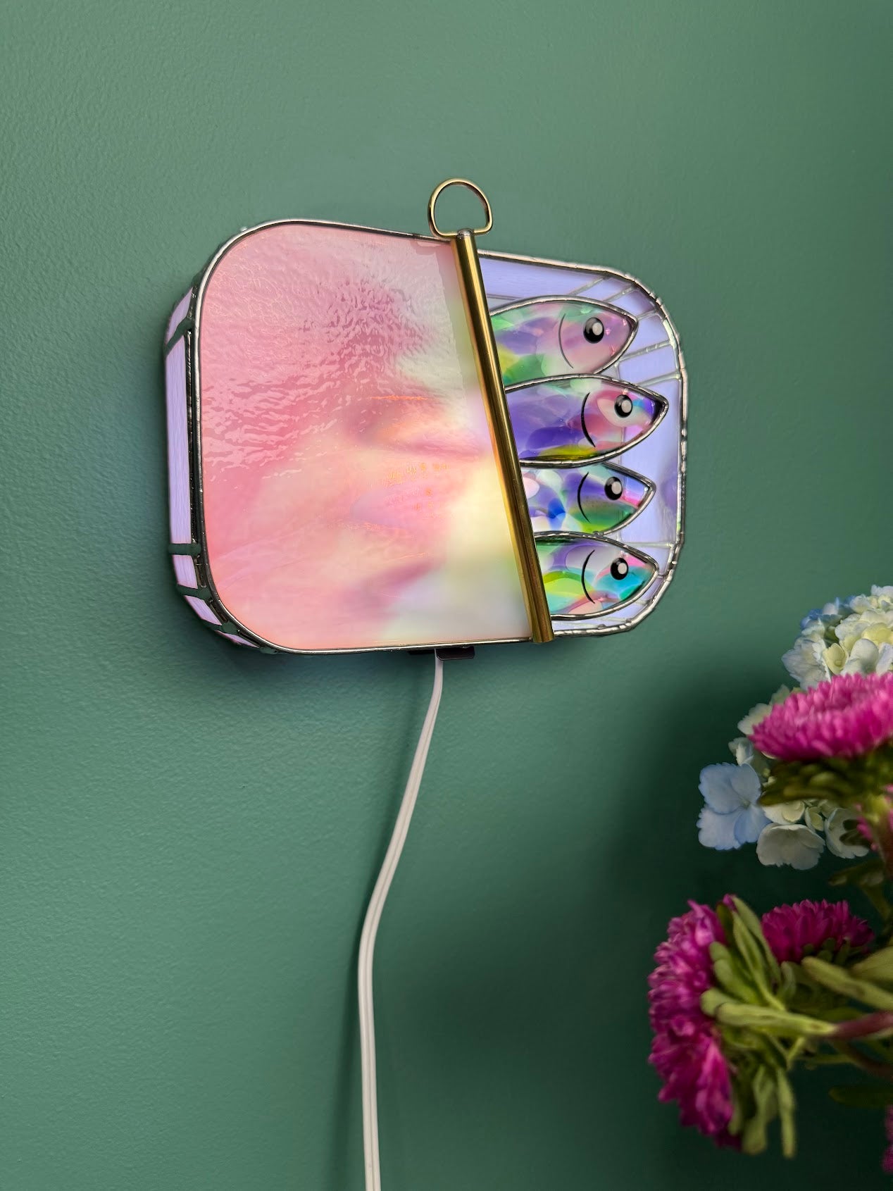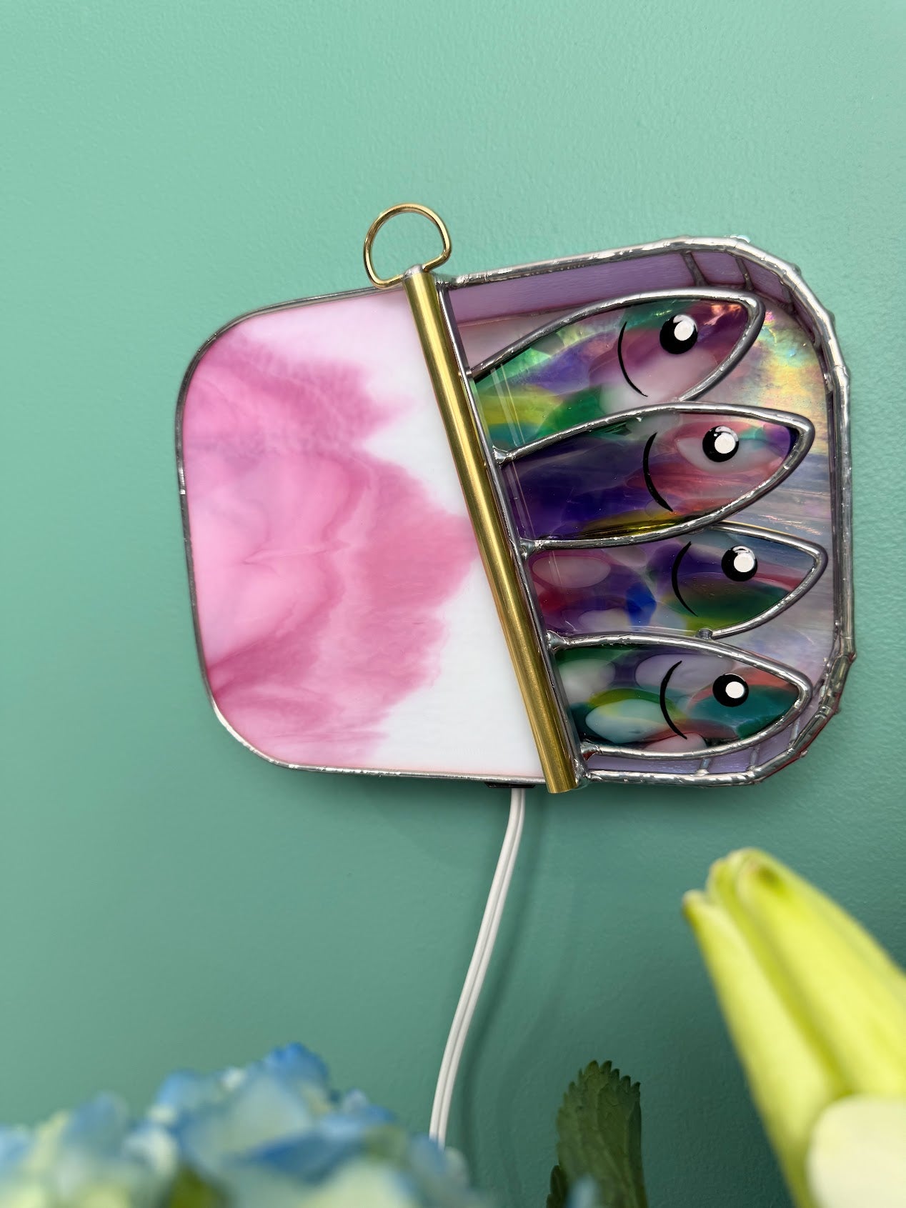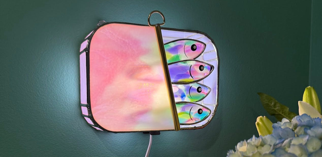 The wonderfully unique sardines are crafted from a special mouth-blown glass made by a shop, Fremont Antique Glass Co, in Seattle, Washington. For the lid, I chose a beautiful wispy baby pink and white stained glass which happens to be a limited production run making your sardine lamp truly limited edition! The outer body of the tin is made with a soft lavender stained glass to complement the cotton candy vibes