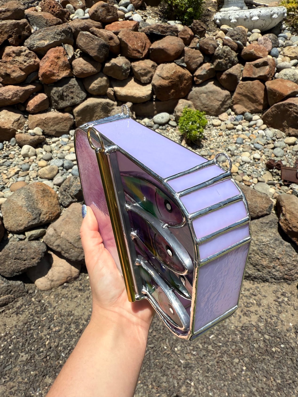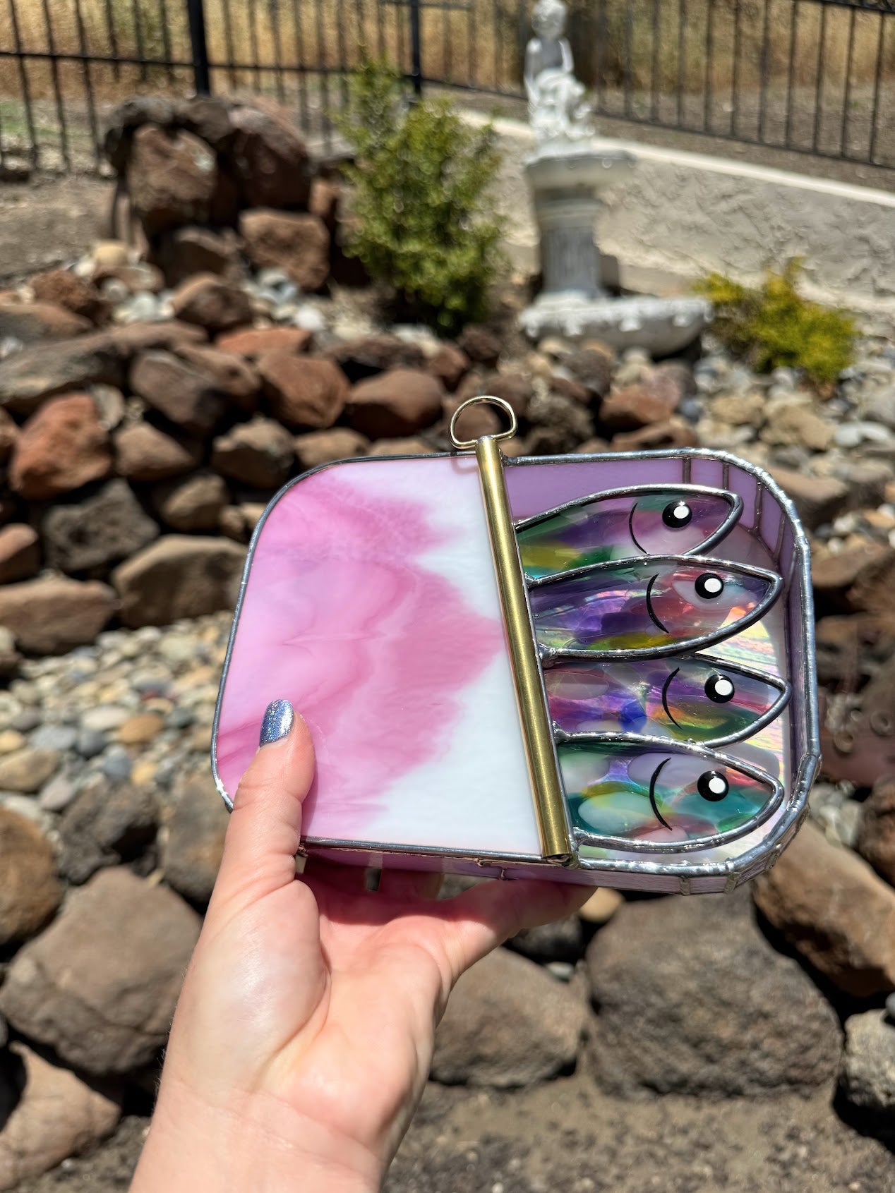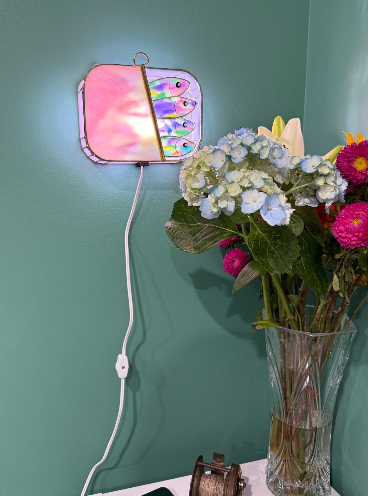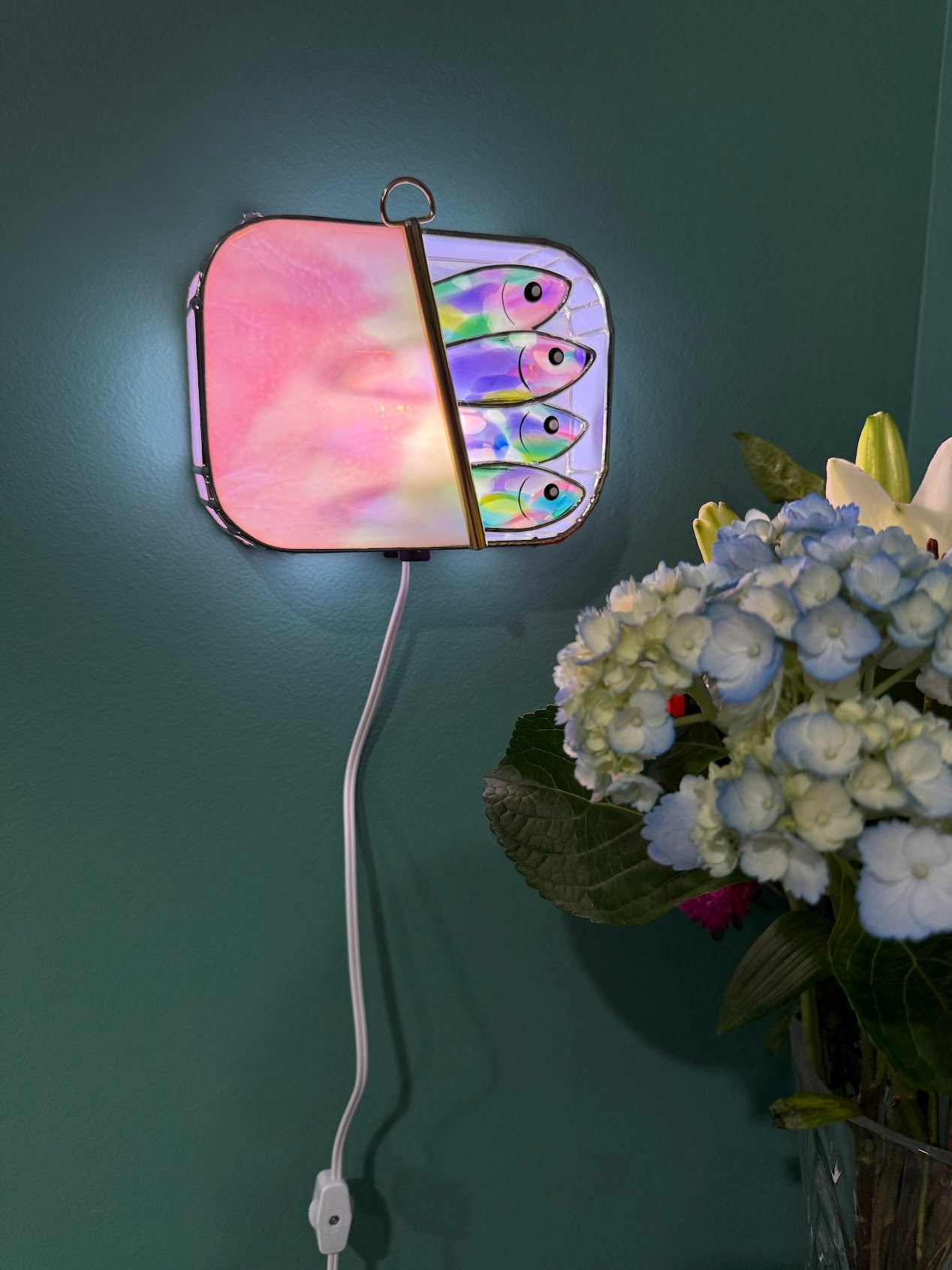 The wonderfully unique sardines are crafted from a special mouth-blown glass made by a shop, Fremont Antique Glass Co, in Seattle, Washington. For the lid, I chose a beautiful wispy baby pink and white stained glass which happens to be a limited production run making your sardine lamp truly limited edition! The outer body of the tin is made with a soft lavender stained glass to complement the cotton candy vibes
